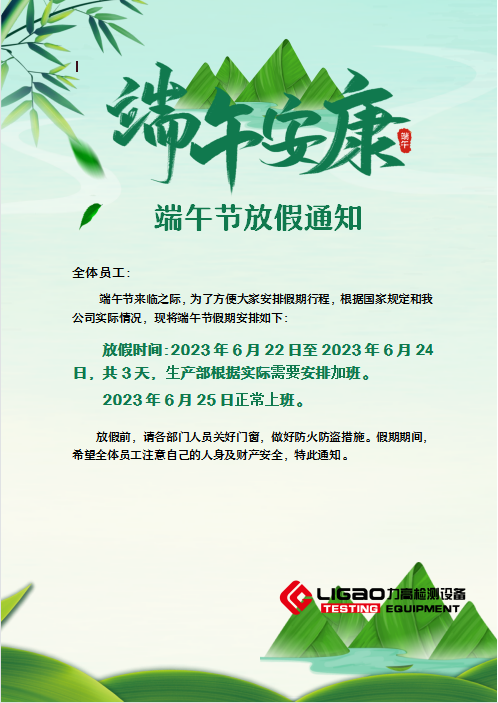 門插艾,香滿堂,吃粽子,撒白糖”,時光荏苒,一年一度的端午節(jié)即將到來,拉力試驗(yàn)機(jī)生產(chǎn)廠家江蘇力高檢測設(shè)備有限公司提前祝全體員工端午安康,一帆風(fēng)順。端午節(jié)是中國的傳統(tǒng)節(jié)日,2023年根據(jù)國家節(jié)假日管理按排放假3天。祝大家:端午節(jié)快樂。